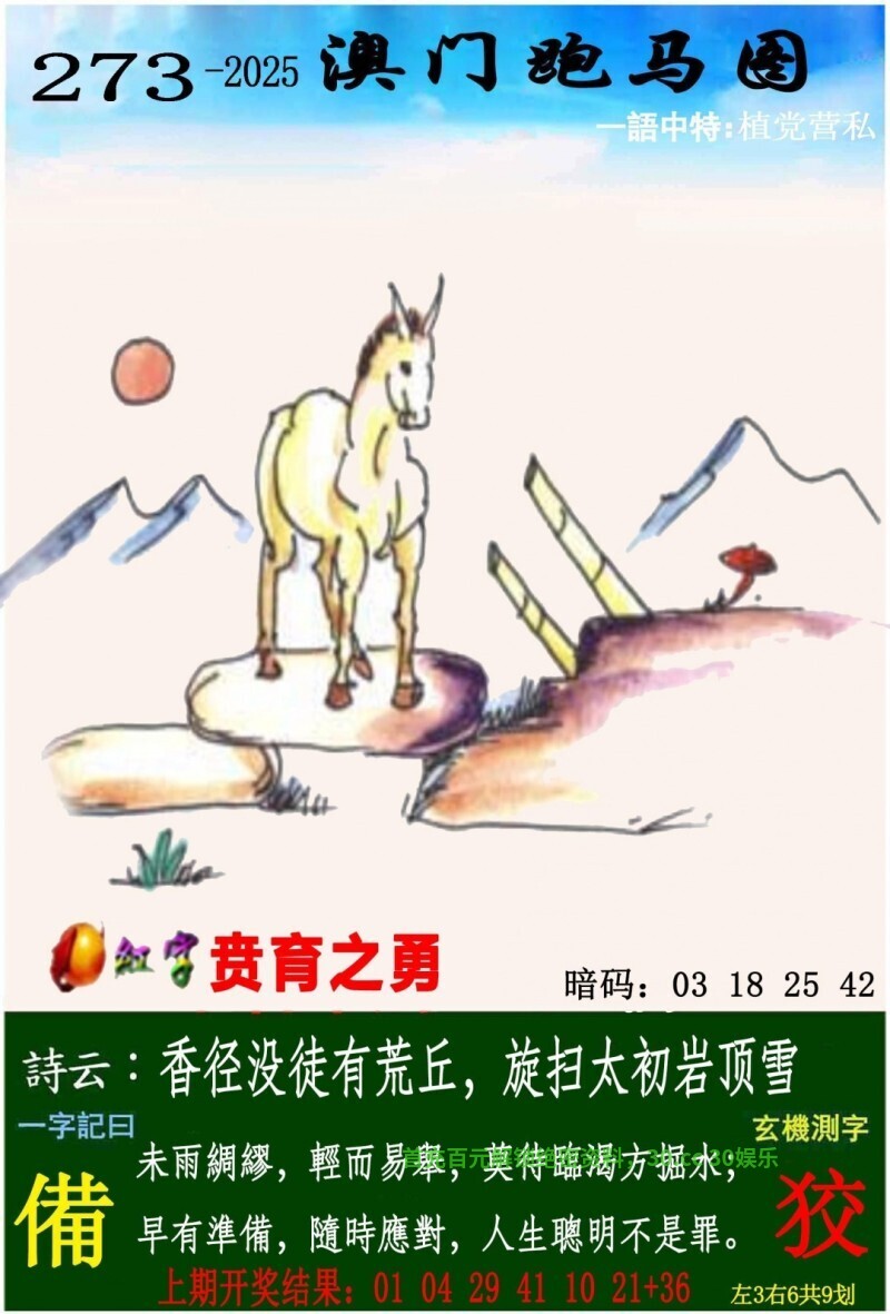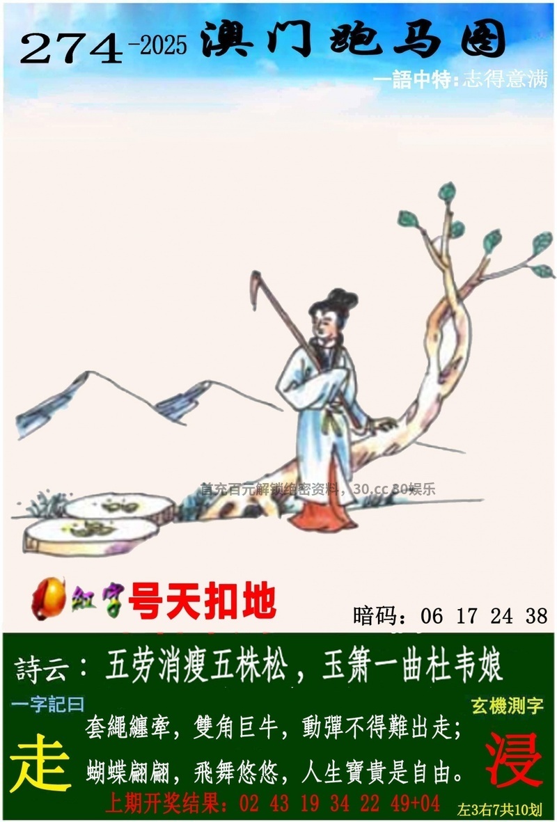 传真274期 今期生肖四五开,农民视它家中宝。 一生之计在于辰,一言必中在掌中。 二五相合一七开,龙吟虎啸一时发。 白姐指美在七九,选好特码快下手。 节外生枝 解:今期农民视它家中宝,解家禽生肖牛猪鸡羊狗马,龙吟虎啸一时发,解阴肖鼠龙蛇马狗猪。 拐特生肖:马兔狗羊猴猪龙鸡鼠 |
